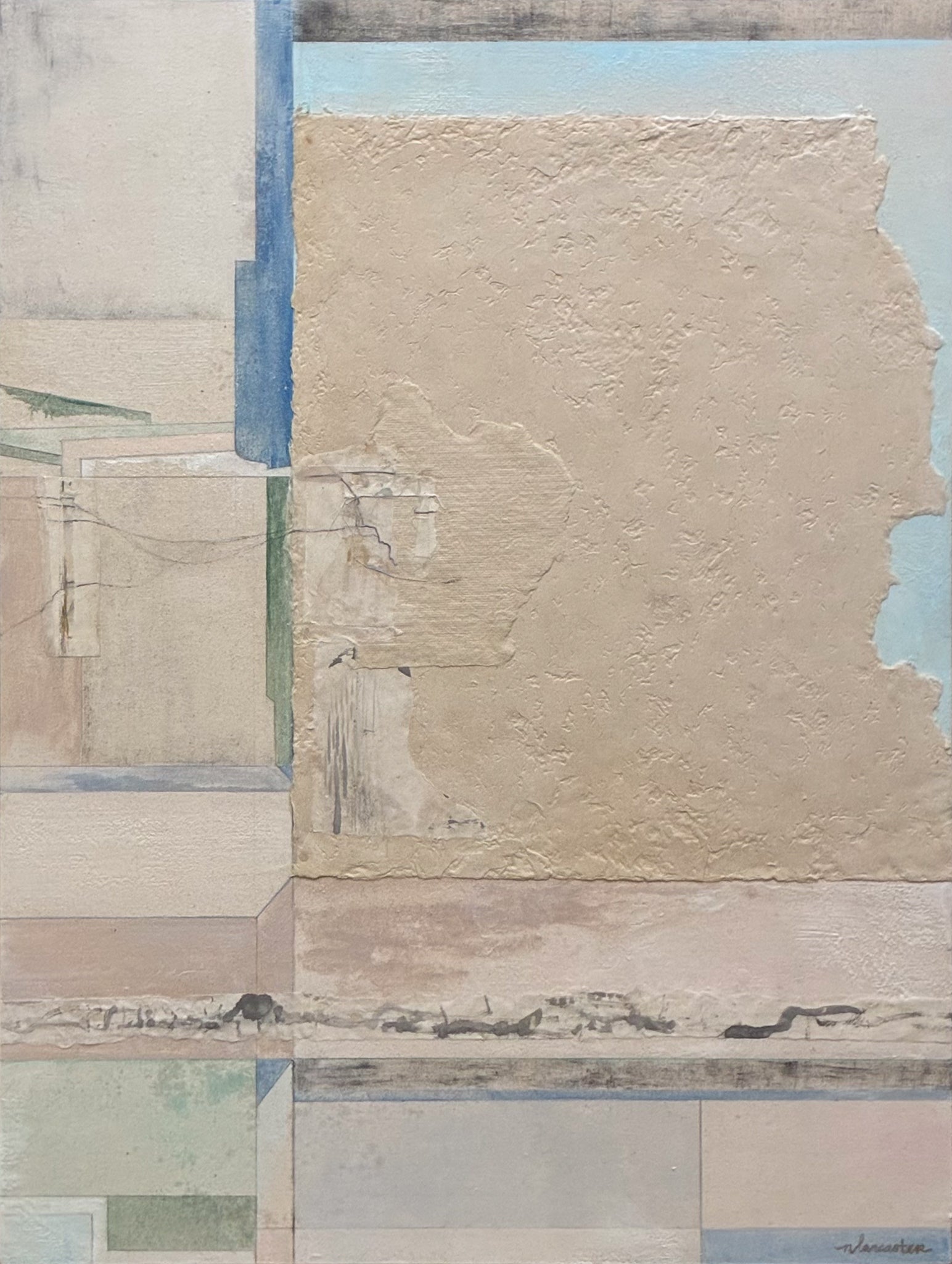 - Mixed media - oil paint, encaustic medium, handmade paper, and charcoal on birch panel