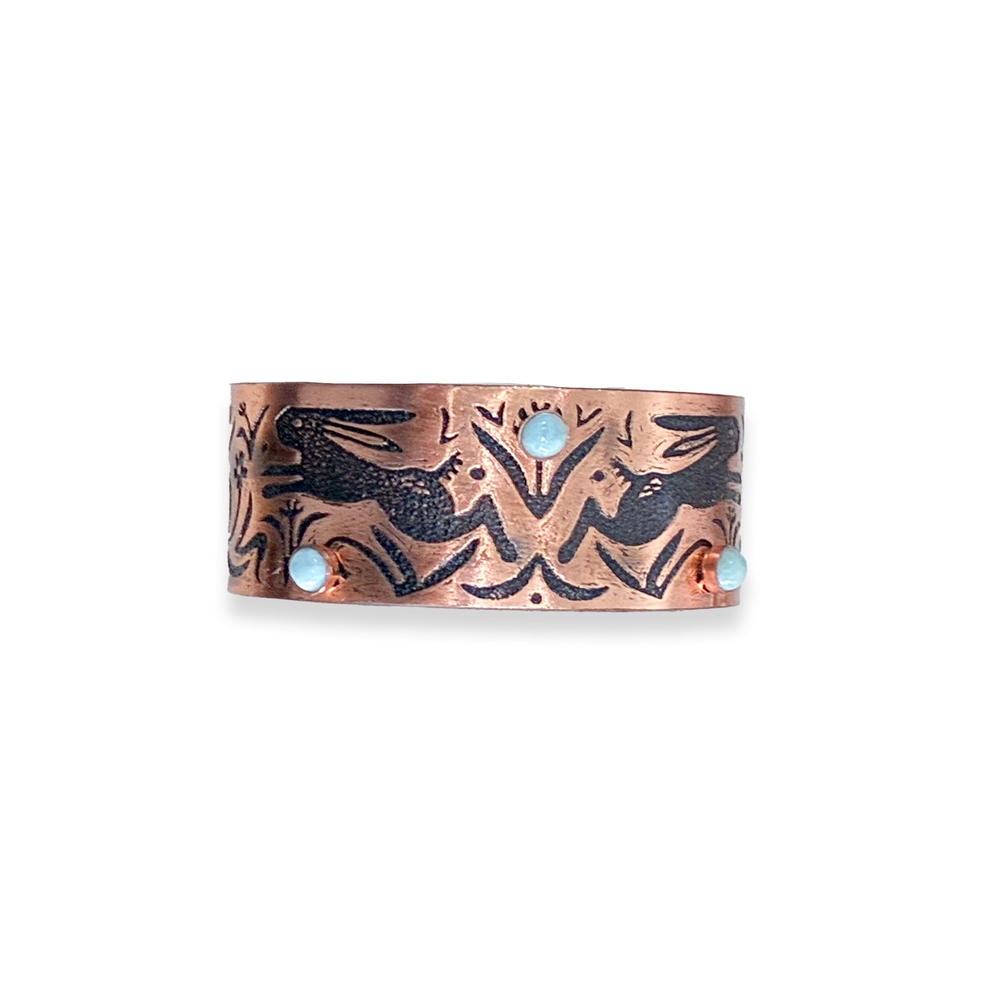 - Pure copper etched with Adam Trest’s original art, oxidized, and sealed. Due to the nature of etching, each cuff will look slightly different.