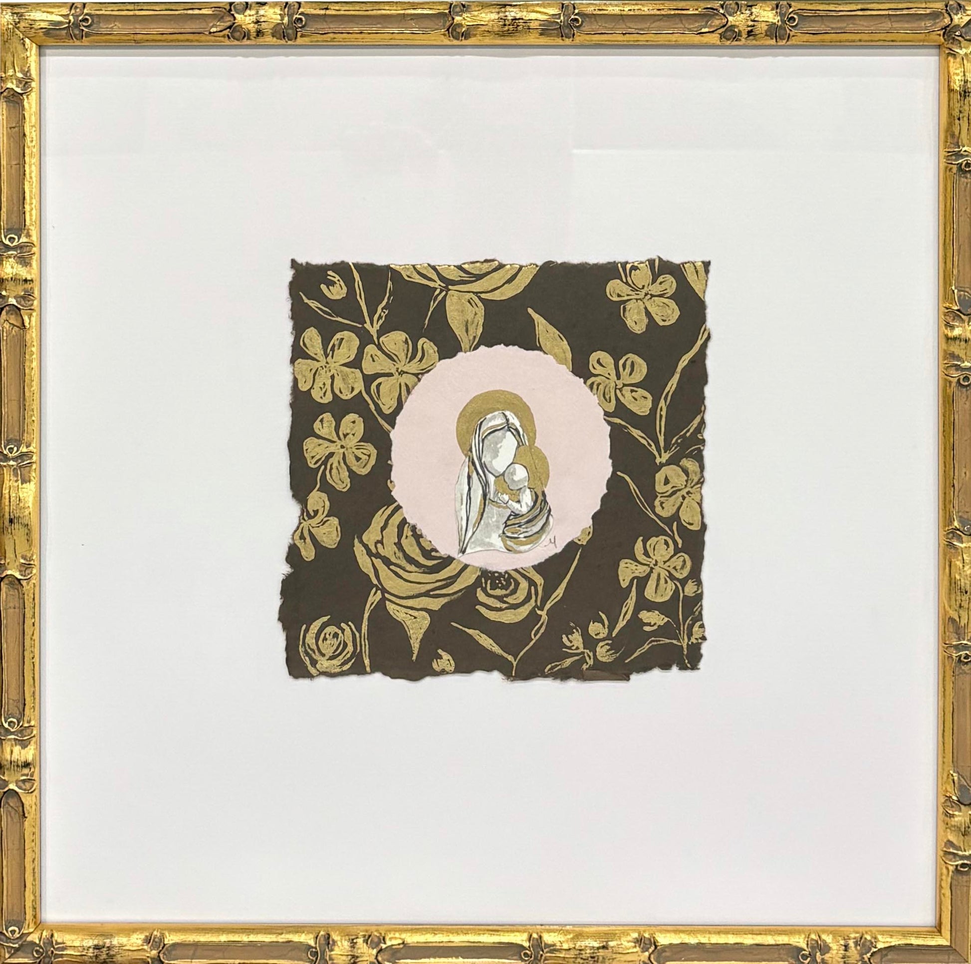 "This soft, sweet Christmas collection has layers of mixed media making up each piece. Using handmade papers in baby blue, soft pink, terracotta and chocolate brown, paired with delicate golden botanicals and ink and gold classic Christmas scenes, these paintings came together so beautifully. I cherished making each piece and I hope collectors will adore these pieces not only during the holiday season, but throughout the year!"