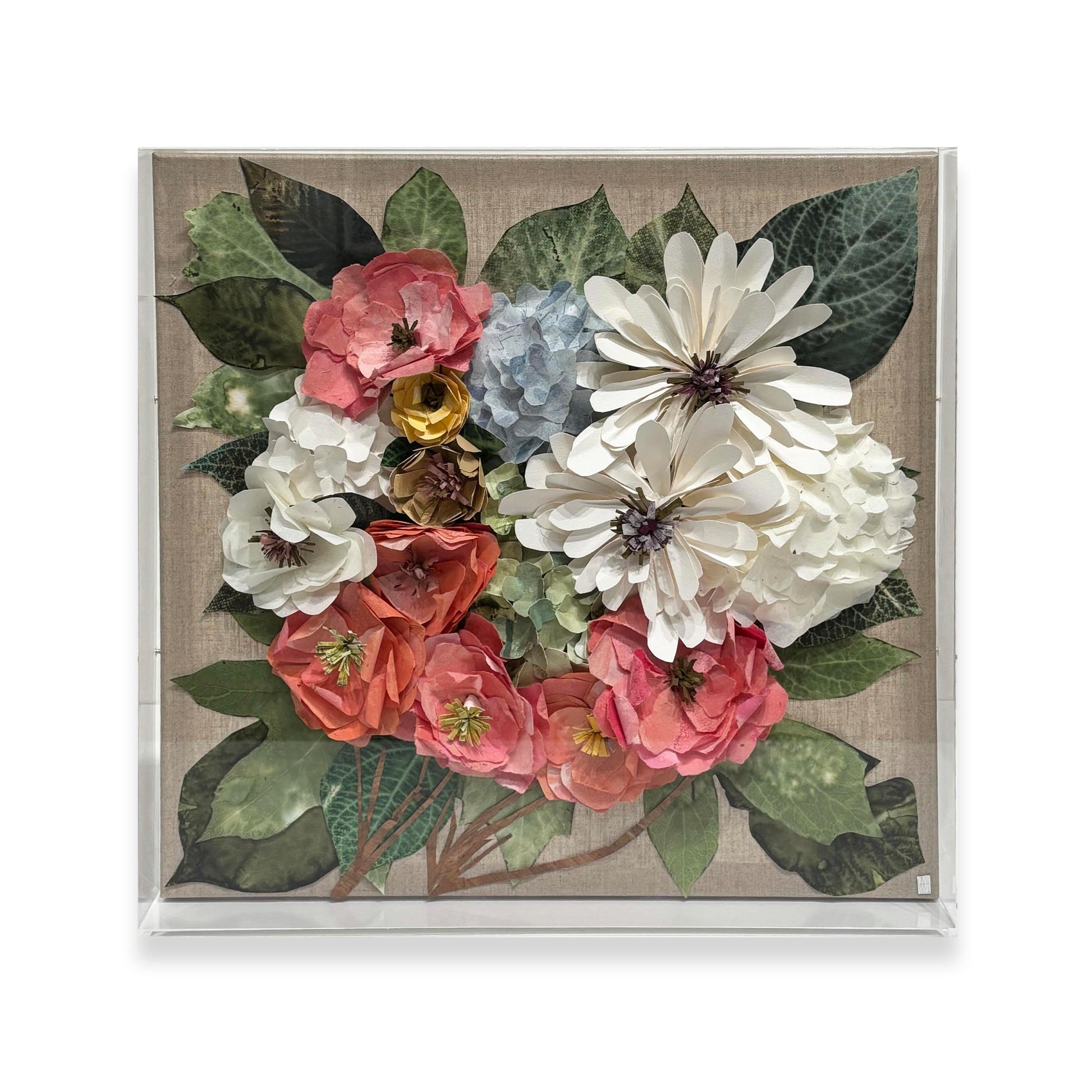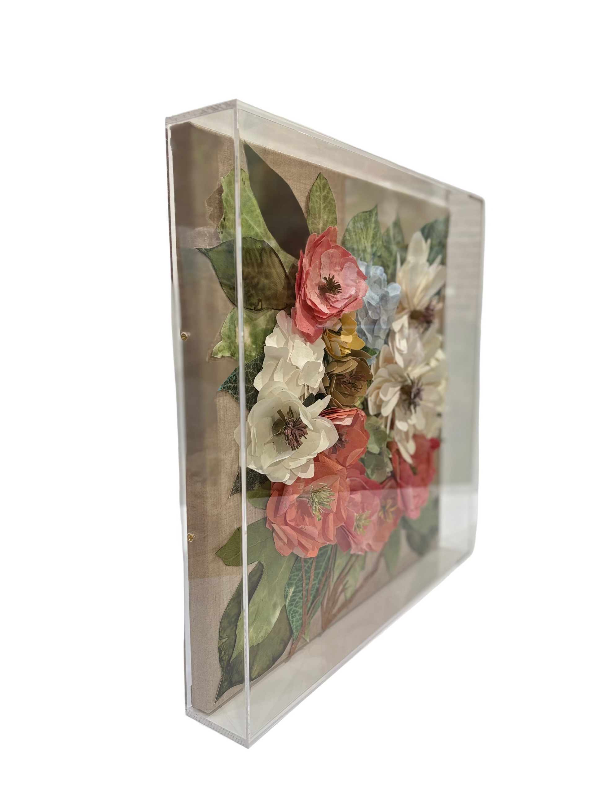 • Hand Painted and Hand Cut Collage on linen canvas in acrylic box