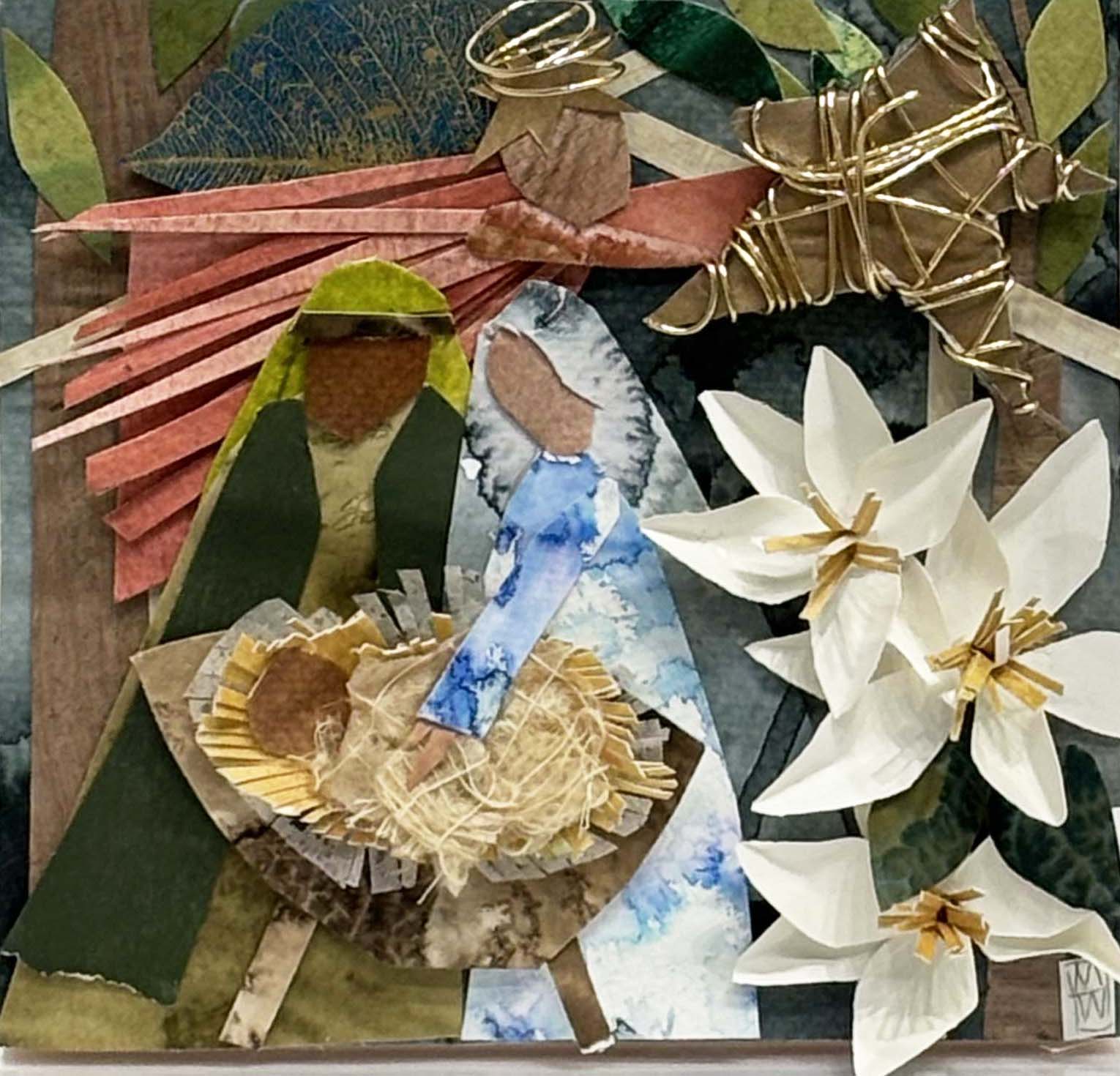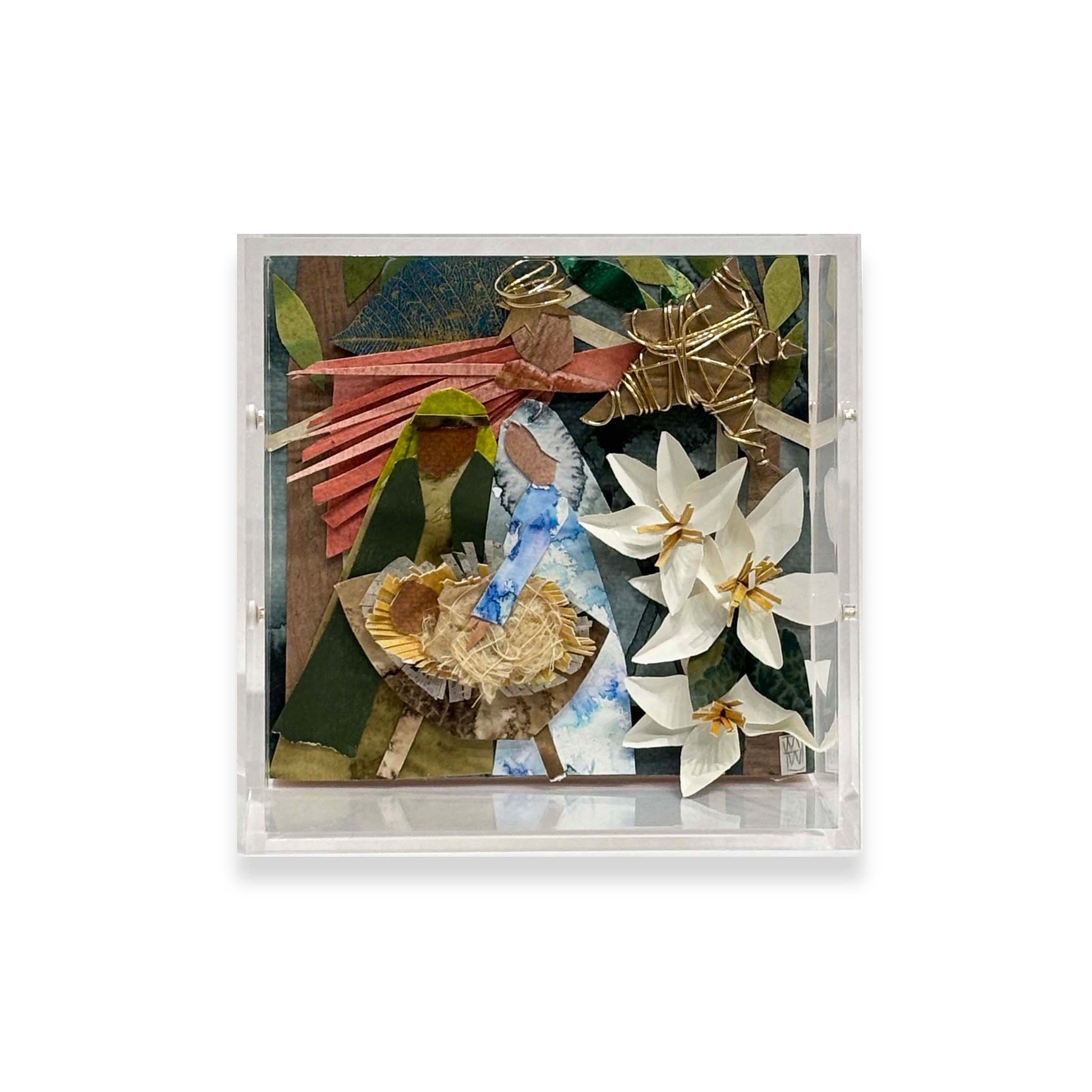 - Hand Painted and Hand Cut Collage Manger Scene on wood in acrylic box