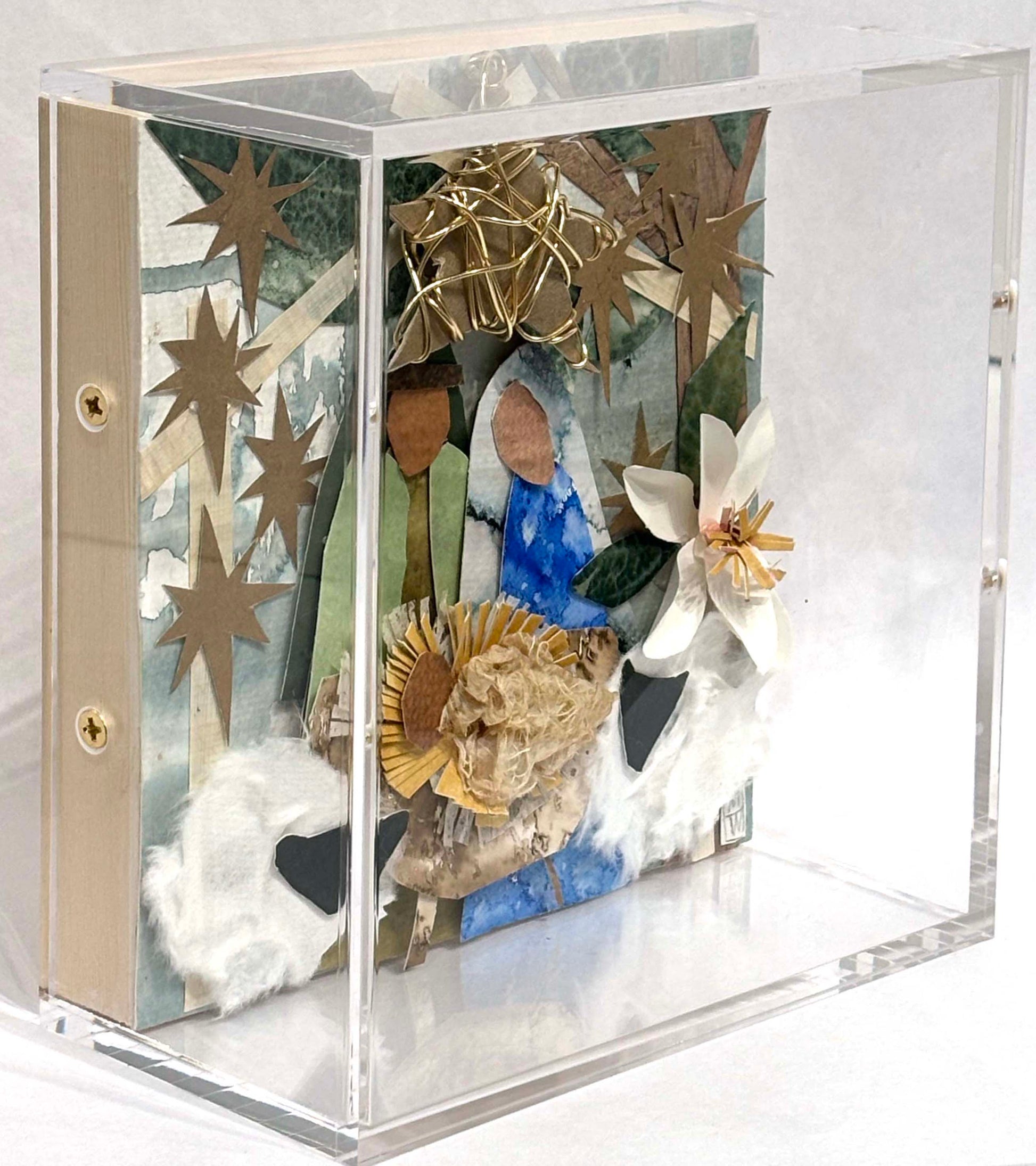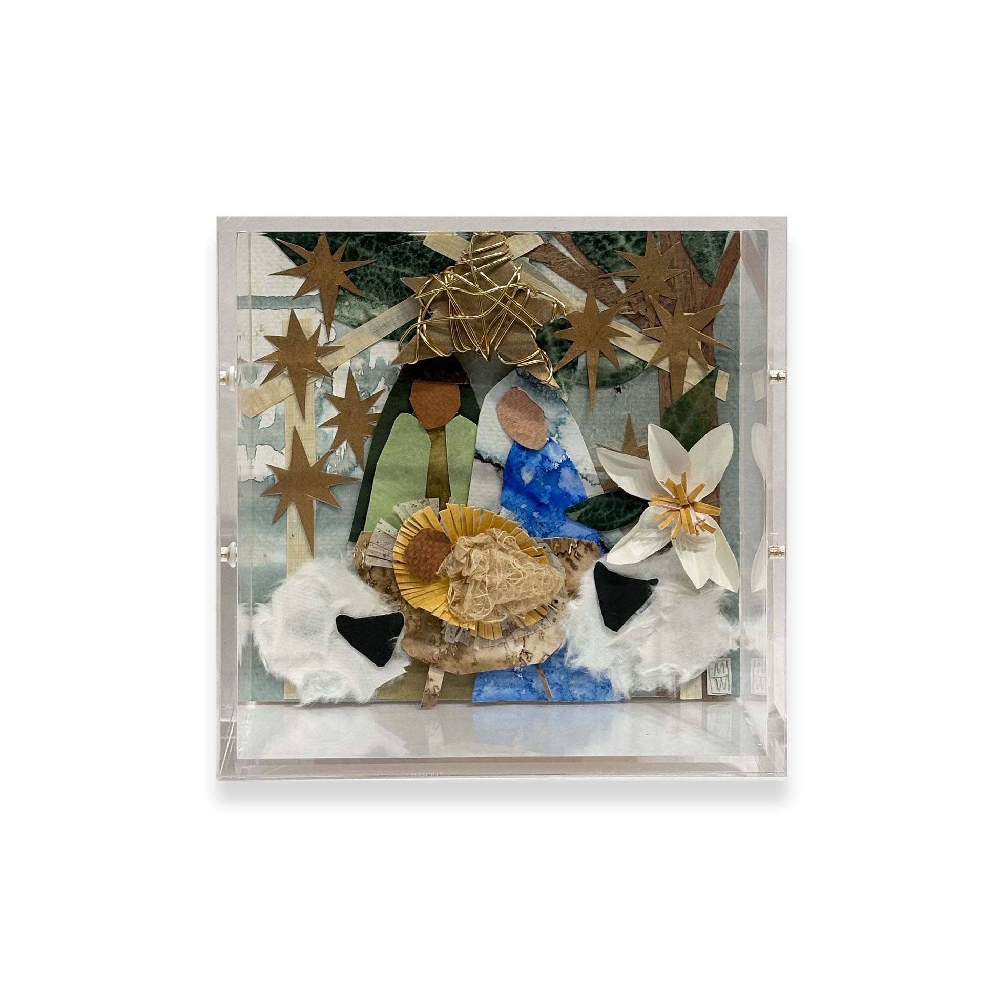 • Hand Painted and Hand Cut Collage Manger Scene on wood in acrylic box