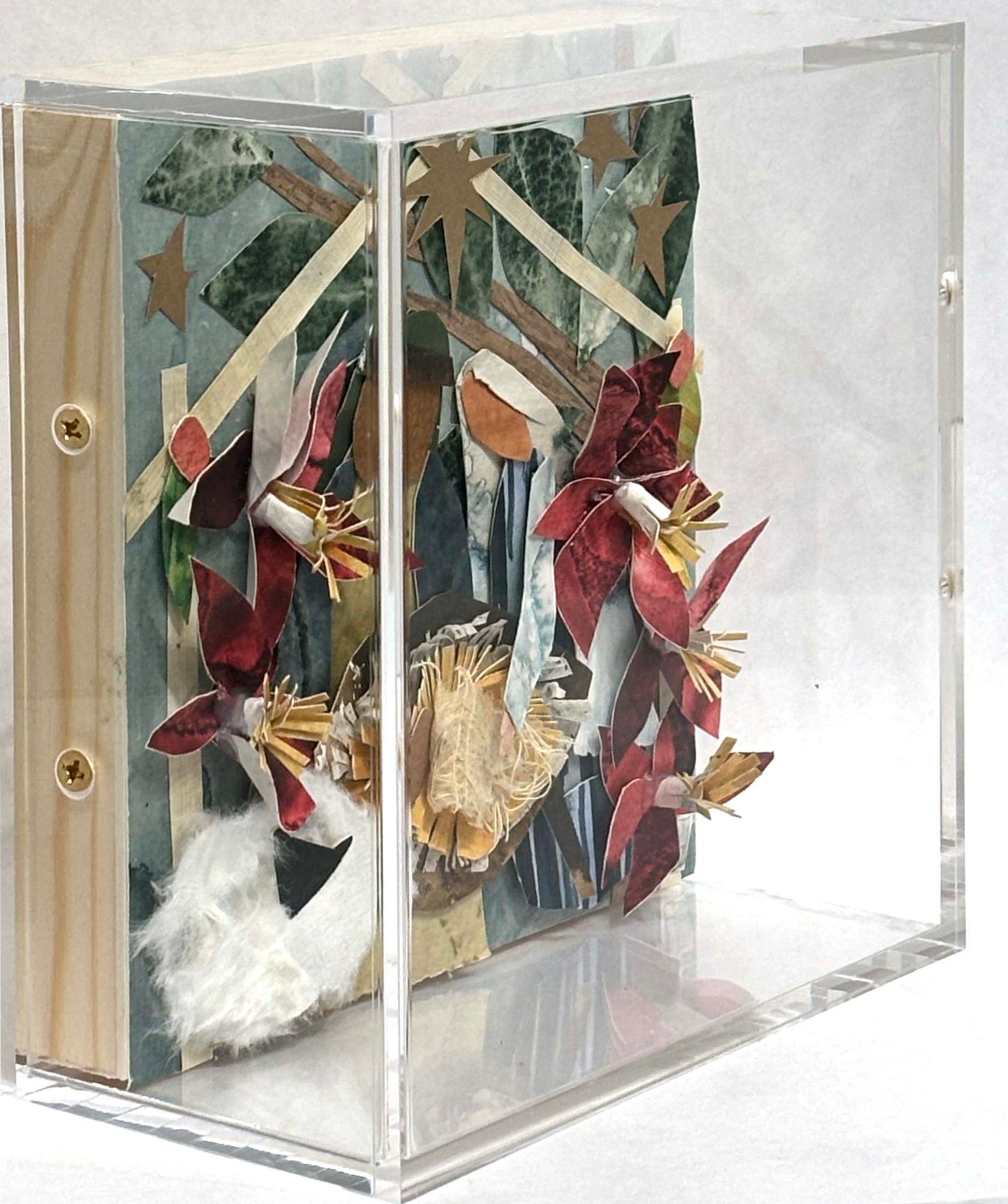 - Hand Painted and Hand Cut Collage Manger Scene on wood in acrylic box