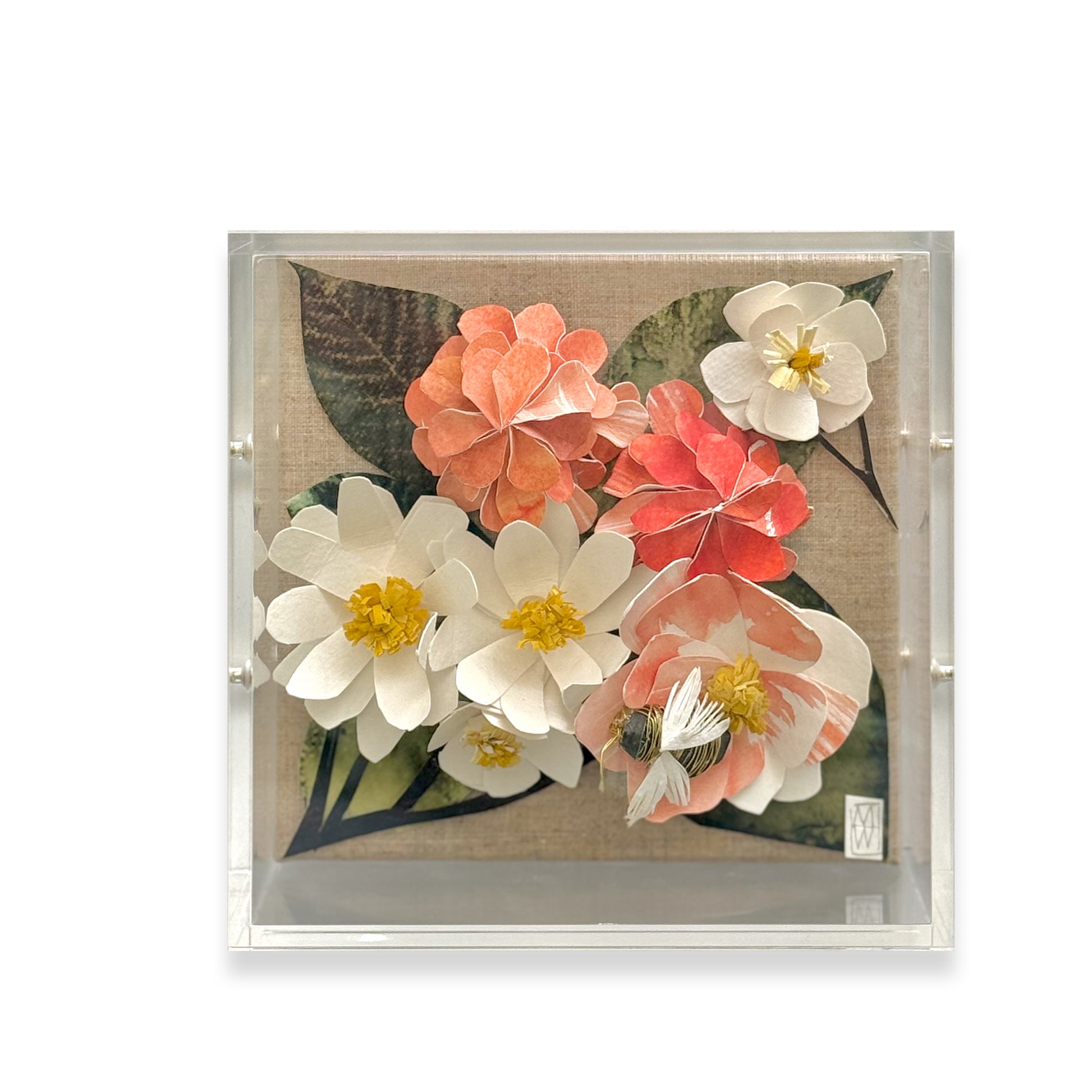 - Hand Painted and Hand Cut Collage on linen canvas in acrylic box